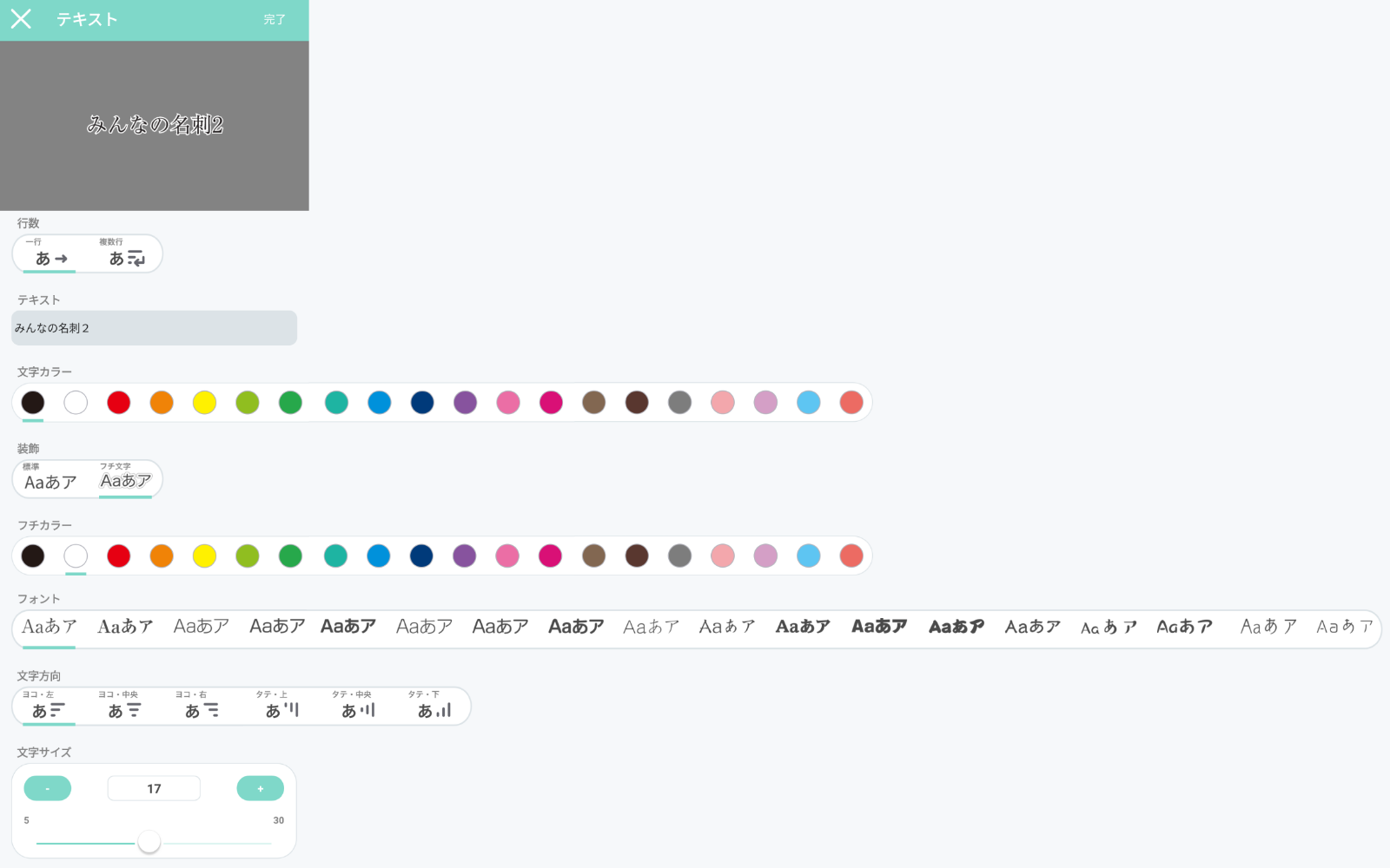 HOME > ABOUT APP > 使い方(詳細1) PREV | 1 | 2 | 3 | NEXT テキスト編集機能 6種類の編集機能と18種類のフォントで様々な表現方法が可能に。 文字カラー:文字の色が変えられます。(20種)装飾:フチ文字に出来ます。背景が写真の場合などに見やすくなります。(フチのカラー20種)フォント:モリサワフォント18種類から選択可能です。文字方向:横書き、縦書き、右寄せ、左寄せ、中央揃えなど。文字サイズ:5pt〜30ptまで。 PREV | 1 | 2 | 3 | NEXT ページトップへ